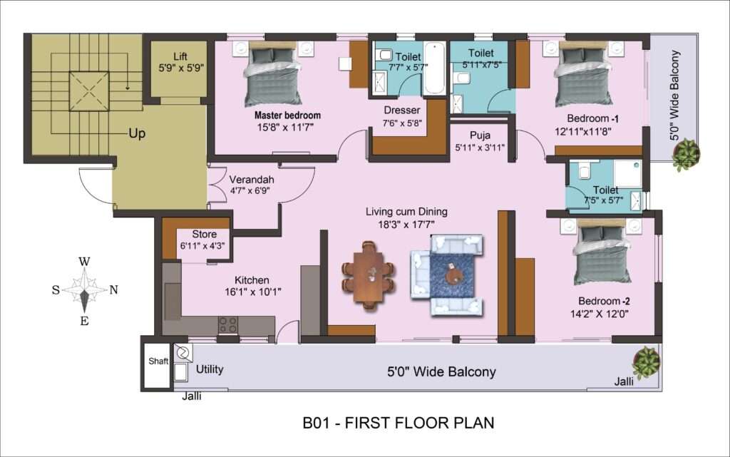 - Generator with backup for common areas, car parking, pumps, and power backup of 1000W/3BHK, 800W/2BHK & 1500W for Penthouse units.
